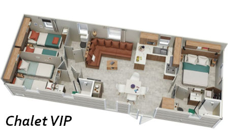 Passez un agréable séjour dans le chalet VIP trois chambres avec grand confort et équipements: Machine à laver, lave-vaiselle, terrasse de 24m² totalement fermé.